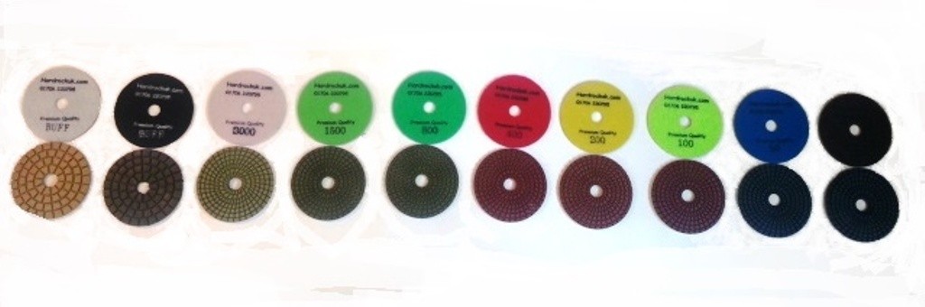 I personally find that the spiral design is more flexible than other available designs. For best results I recommend using water with the pads. 30#, 50# x 3.5mm thick last a long time and can be used dry a little. Hardrockuk.com only stocks the premium diamond content polishing pads in this range. Made in Korea.